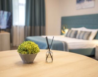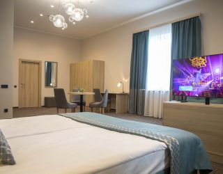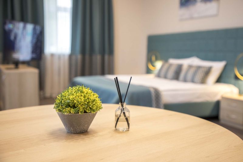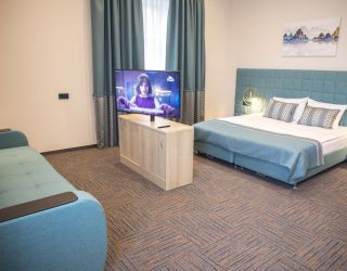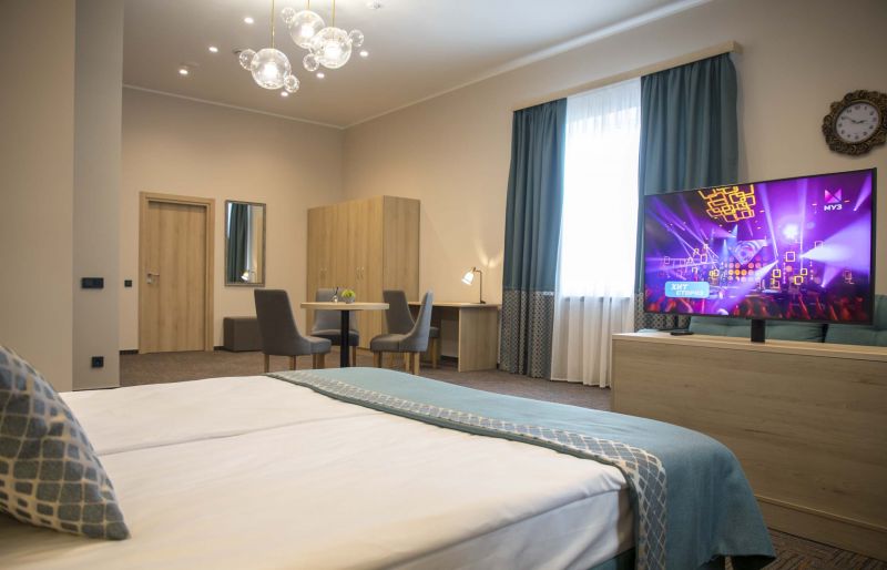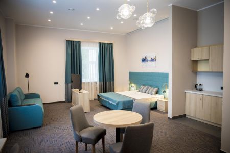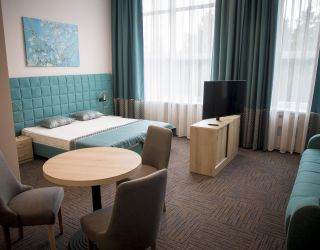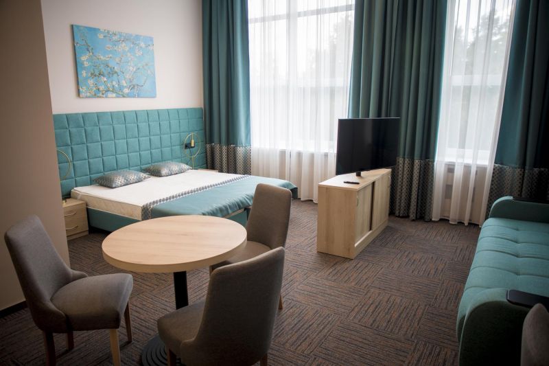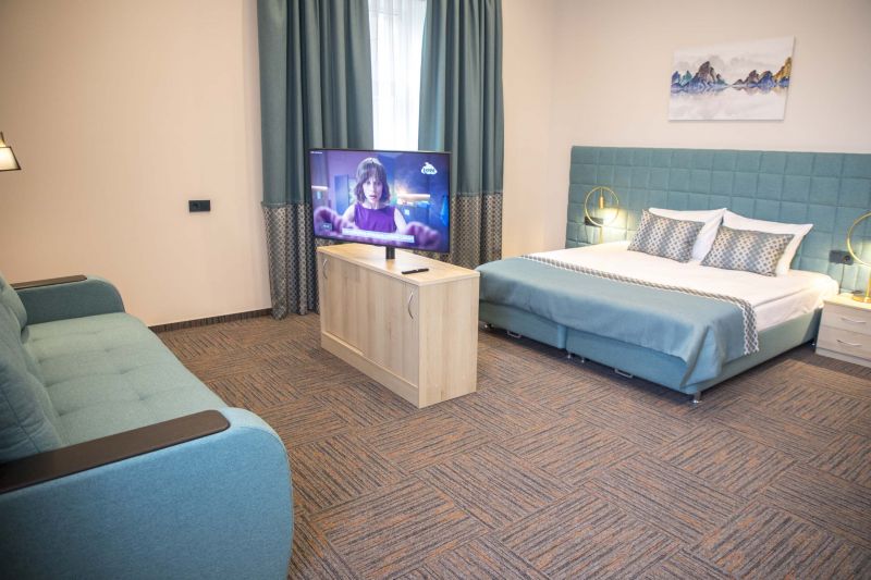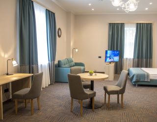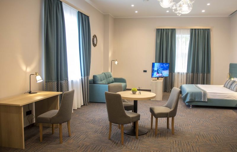 Интерьер выдержан в приятных изумрудно-бежевых тонах. Классическая мебель, мягкое освещение, создают безмятежную комфортную атмосферу, способную удовлетворить любого Гостя.